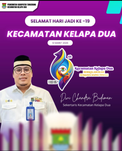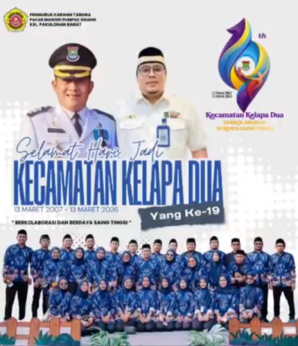 βSembilan belas tahun Kecamatan Kelapa Dua sudah didirikan dan beroperasional. Setiap tahunnya terus berusaha untuk meningkatkan kebaikan-kebaikan terutama adalah meningkatkan percepatan pelayanan kepada masyarakat dan meningkatkan kualitas pembangunan,β ungkapnya