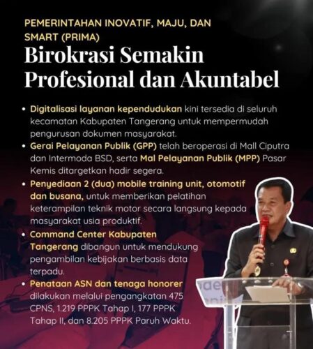 POSTJKTC.COM | Kabupaten Tangerang – Satu tahun masa kepemimpinan Bupati Tangerang Drs. H. Moch. Maesyal Rasyid bersama Wakil Bupati Hj. Nurul Intan menunjukkan berbagai inovasi pembangunan di Kabupaten Tangerang. Beragam program telah dijalankan untuk meningkatkan kualitas layanan publik dan kesejahteraan masyarakat.